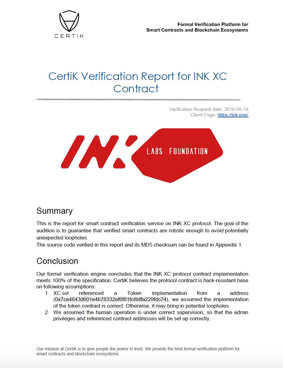 2018년 5월, Ink는 블록체인 보안 분야의 CertiK과 제휴를 맺고, Ink 크로스체인 스마트 컨트랙트 코드를 형식적으로 검증하여 안전하고 강력한 Ink 자산을 공동으로 조성하도록 의뢰하였습니다.