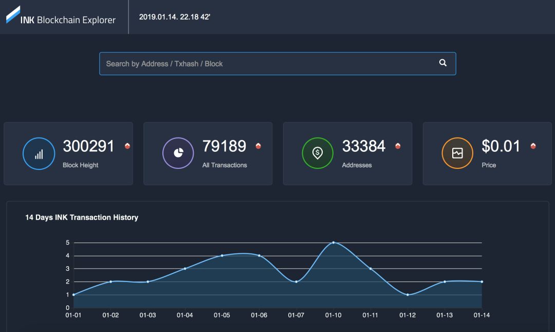 2018년 1월 INK Blockchain Explorer 정식 출시, 사용자는 거래 ID, 블록 해시 값과 블록 높이와 같은 거래 세부 사항을